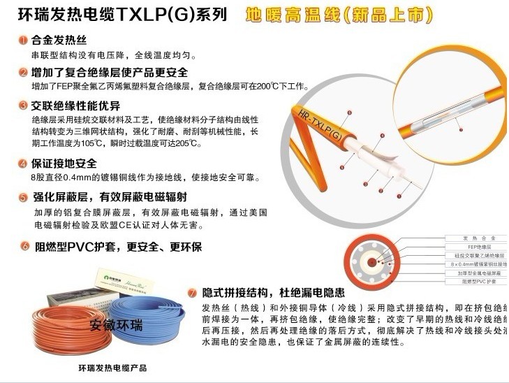 采用雙層絕緣、隱式拼接,包括多股發熱合金,所述的發熱合金外依此包覆無色透明氟隆絕緣層、火焰及蒸汽交聯聚乙烯絕緣層、8*0.4mm鍍錫紫銅絲接地、加厚型金屬電磁屏蔽,阻燃型PVC外護套。