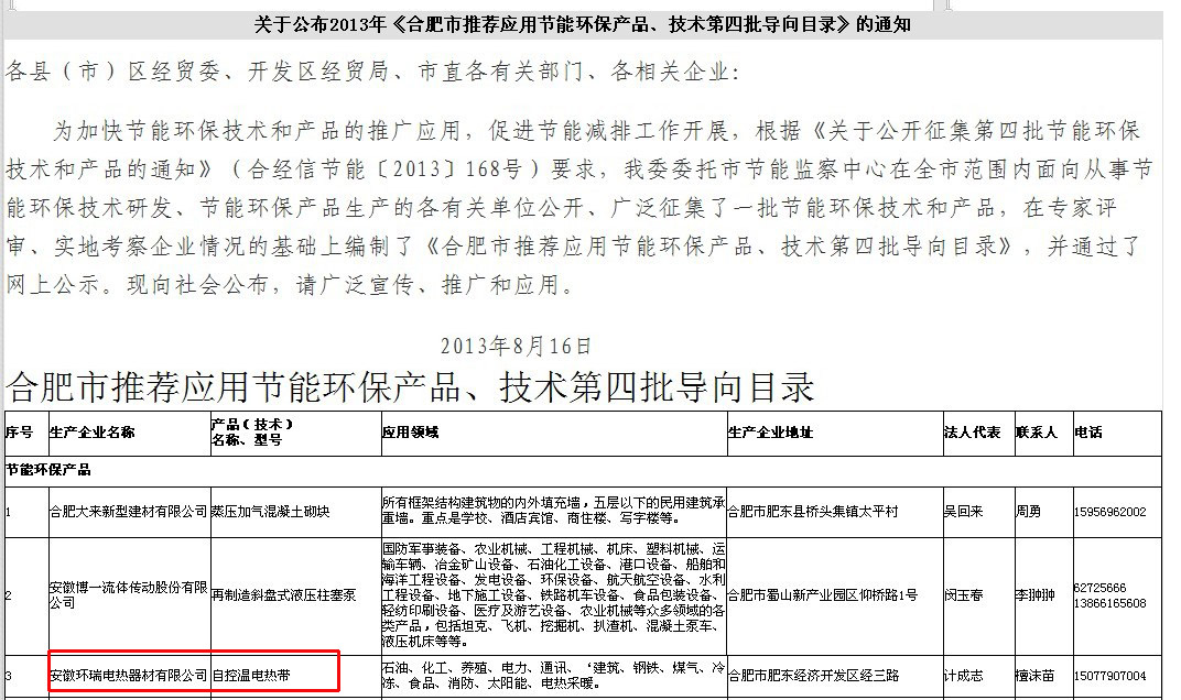 環(huán)瑞作為合肥經(jīng)濟(jì)科學(xué)建設(shè)道路上的重要成員,一直朝著“科技環(huán)瑞,電熱成就世界”的偉大藍(lán)圖邁進(jìn),其具有低電阻過渡層的自限溫電伴熱產(chǎn)品先后獲得省,市關(guān)于科技成果的榮譽(yù)有:合肥市科學(xué)技術(shù)獎(jiǎng),安徽省高新技術(shù)產(chǎn)品,合肥重點(diǎn)名牌產(chǎn)品。國(guó)家7項(xiàng)專利證書。其環(huán)保節(jié)能的特點(diǎn)已經(jīng)獲得政府、行業(yè)協(xié)會(huì),及市場(chǎng)的認(rèn)可。目前,環(huán)瑞公司已通過了合肥市推薦應(yīng)用節(jié)能環(huán)保產(chǎn)品、技術(shù)目錄的公示,獲得了環(huán)保節(jié)能產(chǎn)品稱號(hào),以下為合肥經(jīng)濟(jì)和貿(mào)易信息化委員會(huì)網(wǎng)站的公示內(nèi)容: