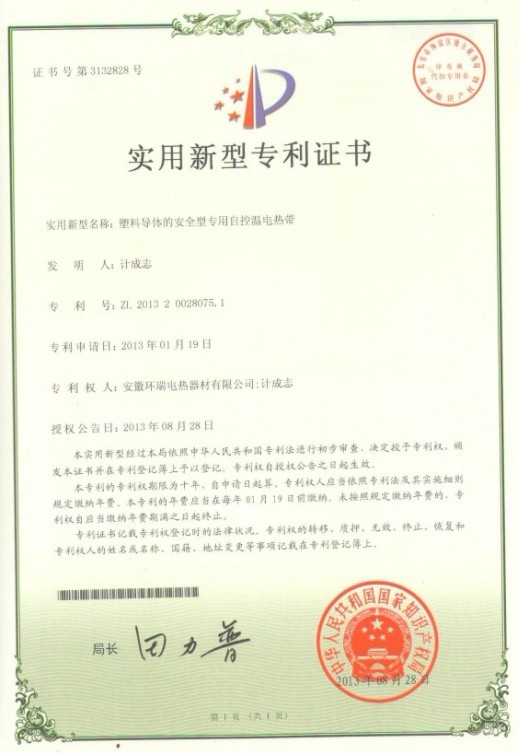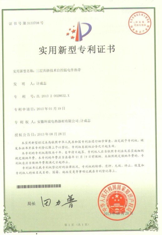 環瑞自成立研發小組至科學技術中心期間,通過獨立開發,與合肥工業大學建立長期合作關系,聘請相關專業的技術專家等模式,投入大量的人力物力。我司以安全,實用性能為目標,對電伴熱帶結構、原材料、生產工藝進行創新,最新研發的“三層共擠自控溫電伴熱帶”“ 塑料導體的安全型自控溫電熱帶”獲得了2項國家專利證書。我司已獲得了5項關于自限溫伴熱帶的國家專利證書,我司伴熱帶的生產技術已達到國內先進。共計19項專利。新的專利證書已下達。